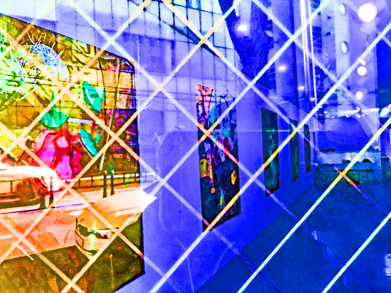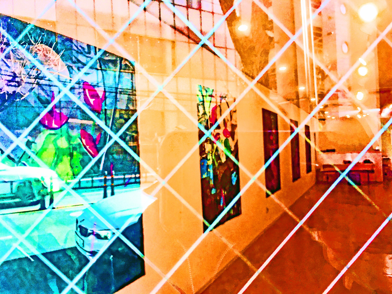 <morning glory 2021-i-back> depicts an image created by a metamorphic image of a morning glory, and the form of a cloth-shaped painting consisting of a grid pattern with a back image reflected is an image that depicts the desire of the others as a reversible shade of light.
