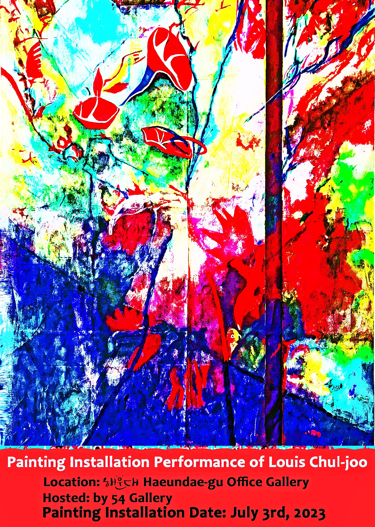 On July 3, 2023, The day before the exhibition of "Morning glory Window" Haeundae-gu Office Gallery, modern image installation artist & abstract painter Louis Choi Chul-joo installed an action painting.