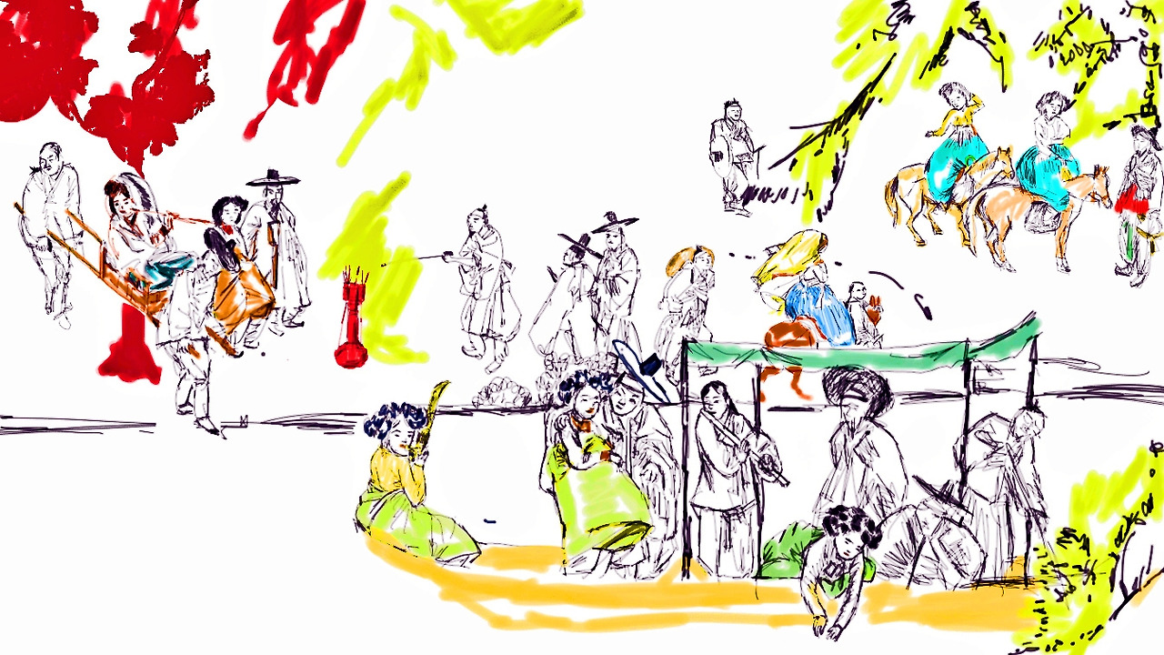 And to express the characteristics of media art, Sin Yun-bok's paintings were reconstructed to create a series of cartoon images based on the play culture of the Joseon.