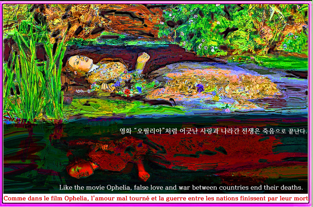 Louis Choi Chul-joo, Like the movie Ophelia, false love and war between countries end their deaths, a hand-painted picture on a computer: Review of Korean News Cartoon [205] Like the movie Ophelia, false love and war between countries end their deaths. (2025-5-12) / Reporter Choi Chul-joo’s Cartoon Review