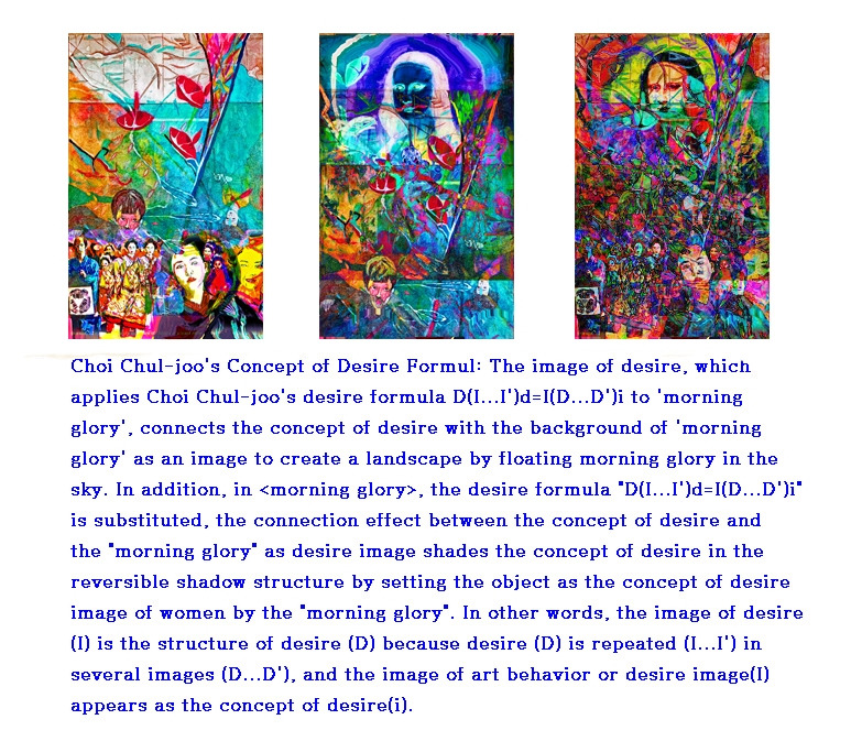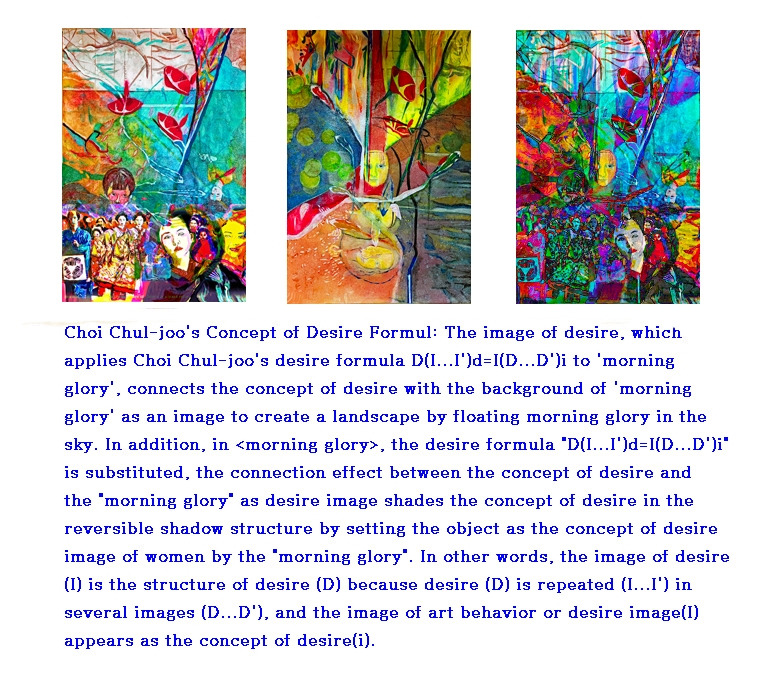 mathematical desire as an axiom of logic in the concept of desire results in reality as a concrete phenomenon rather than based on the external structure of the linguistic meaning through abstract design. Therefore, the rendering of the desire structure revealed by abstract encounter with reality at the intersection of desire outside the window applies the mathematical desire concept abstract design, or the image of the desire concept, to the Choi Chul-joo desire formula, and on March 1, 2022, morning glory appears as a flat real image as the subject of desire as a reversible shade of light in the Flushing Town Hall (New York) exhibition./ The image of desire, which applies Choi Chul-joo's desire formula D(I...I')d=I(D...D')i to 'morning glory', connects the concept of desire with the background of 'morning glory' as an image to create a landscape by floating morning glory in the sky. In addition, in <morning glory>, the desire formula "D(I...I')d=I(D...D')i" is substituted, the connection effect between the concept of desire and the "morning glory" as desire image shades the concept of desire in the reversible shadow structure by setting the object as the concept of desire image of women by the "morning glory". In other words, the image of desire (I) is the structure of desire (D) because desire (D) is repeated (I...I') in several images (D...D'), and the image of art behavior or desire image(I) appears as the concept of desire(i).