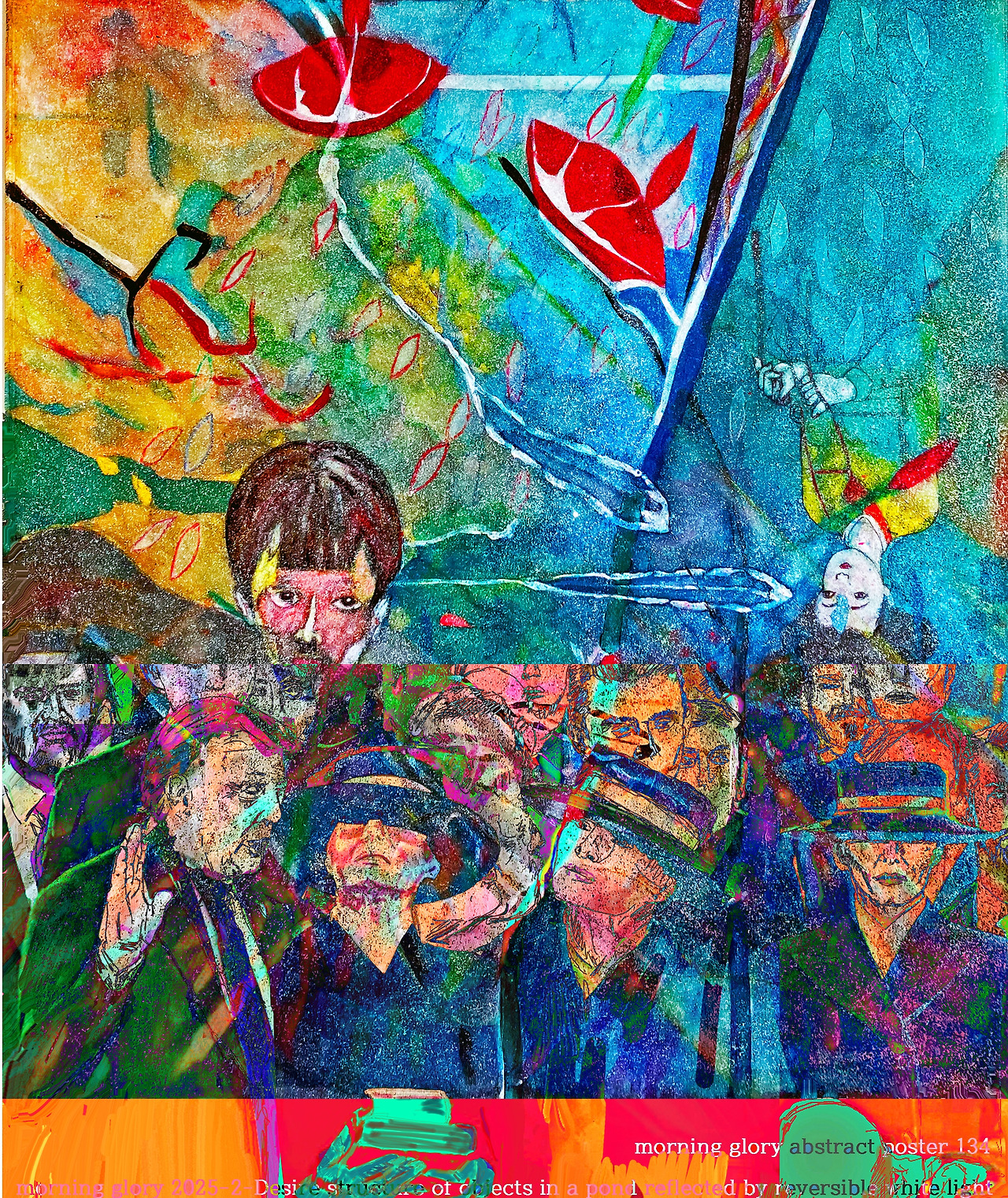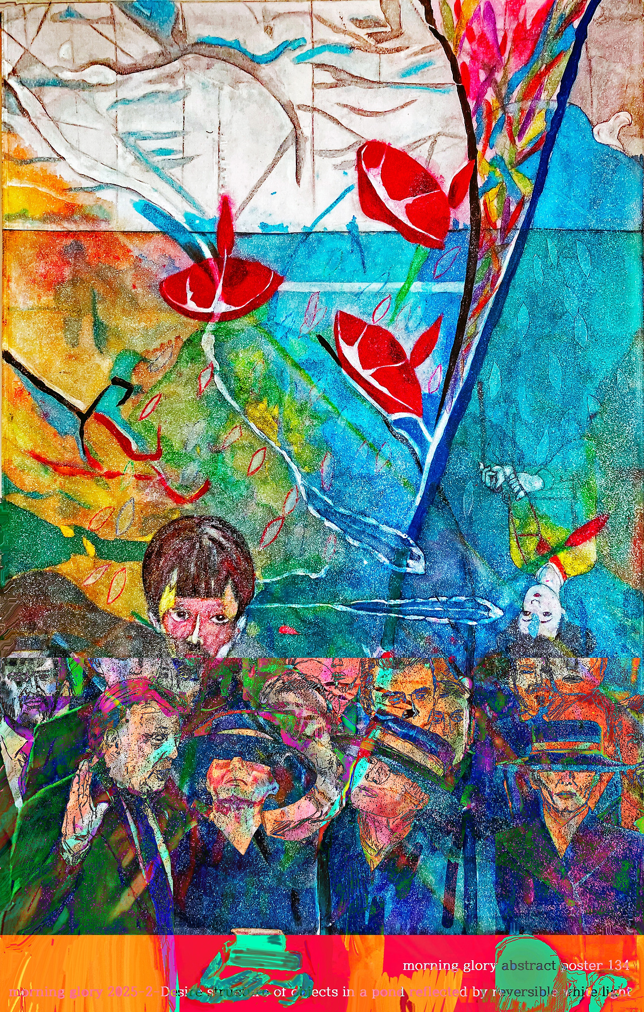 This translates to the first non-realistic abstraction poster at Louis Choi Chul-joo's 2022 New York Exhibition to actualize the Desire Object. The image <morning glory p134-2-Desire structure of objects in a pond reflected-Mona Lisa,> becomes a non-real abstraction of reality.
