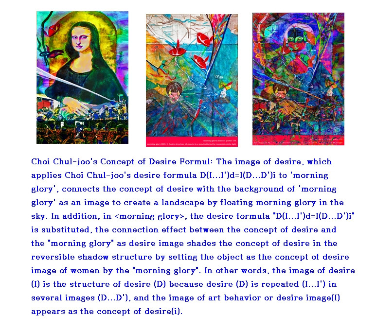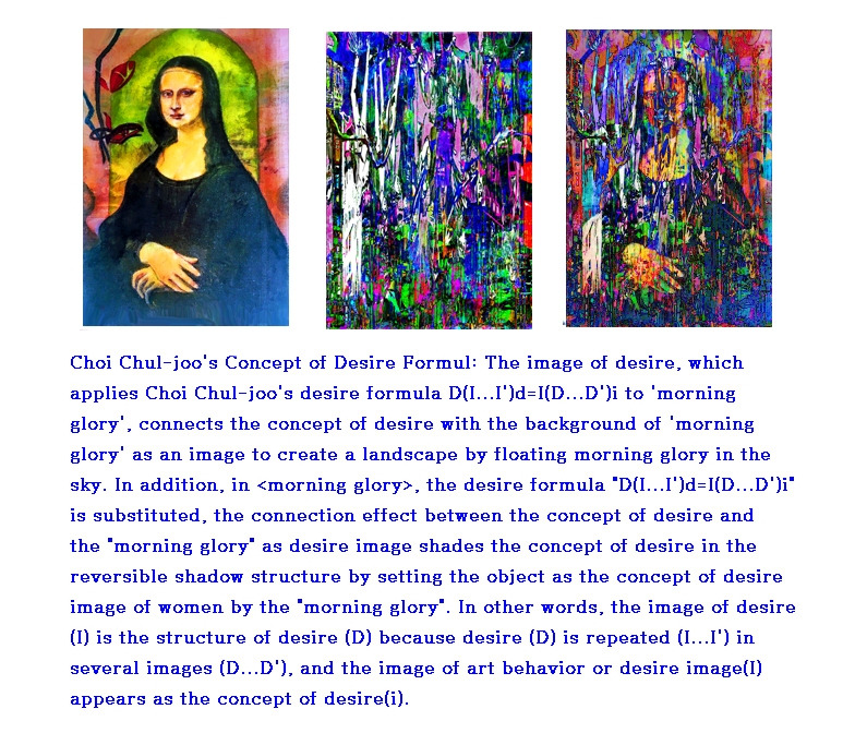 Desire Concept Realistic Abstract Work: Louis Choi chuljoo, morning glory window 2024-5-Mona Lisa: By repeatedly applying the concpept of imaginary world and desire and Choi Chul-joo's desire formula <D(I...I')d=I(D...D'i)i> to the image of the work, it acquires aesthetic value and reveals its meaning by realizing formability in the shadow of reversible light. / The meaning of the shape, which is covered by the actual changed instantaneous movement of the shape, results in linguistic abstraction. In other words, the realistic shape of the other person's desire in a momentary event is a linguistic abstraction of the same meaning. Conceptual art with morning glory and bamboo as cultural background is linguistic abstraction. The abstract creates a conceptual structure based on the shape of subsequent reality fostered by language and hides the desire of others in a momentary event.