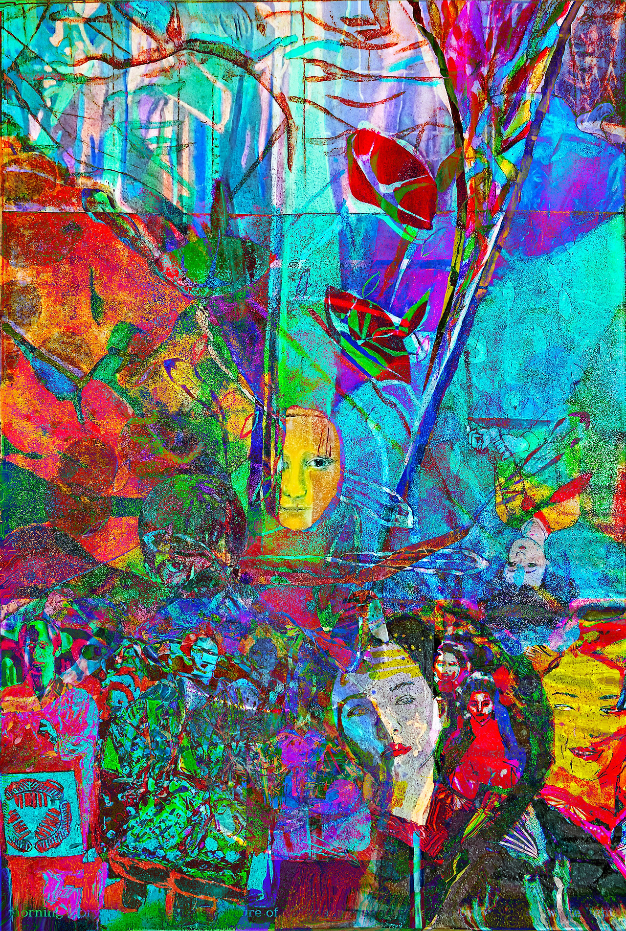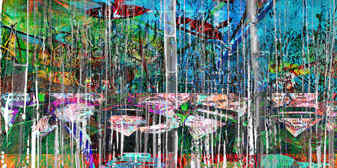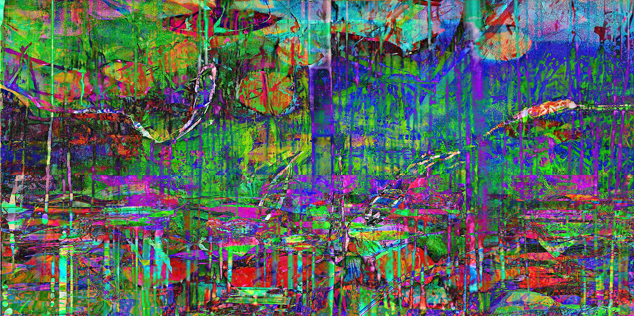 Background image of an artist's artwork: Louis Chul-joo Choi, morning glory p134-2-1-Desire structure of objects in a pond reflected-Mona Lisa, a hand-painted picture on a computer / The visualization of the concept of desire: Visualizing the concept of desire is a cartoon depicting events and performances manually, expressing the background of the cartoon as a landscape of desire with "morning glory" and "Bamboo Forest," and the cartoon image reconstructs desire into an abstract and realistic picture.