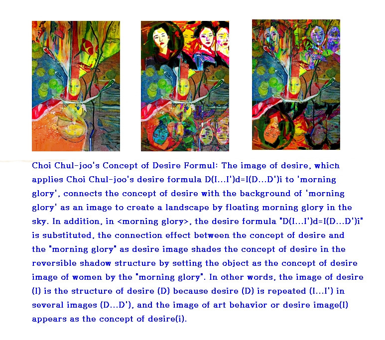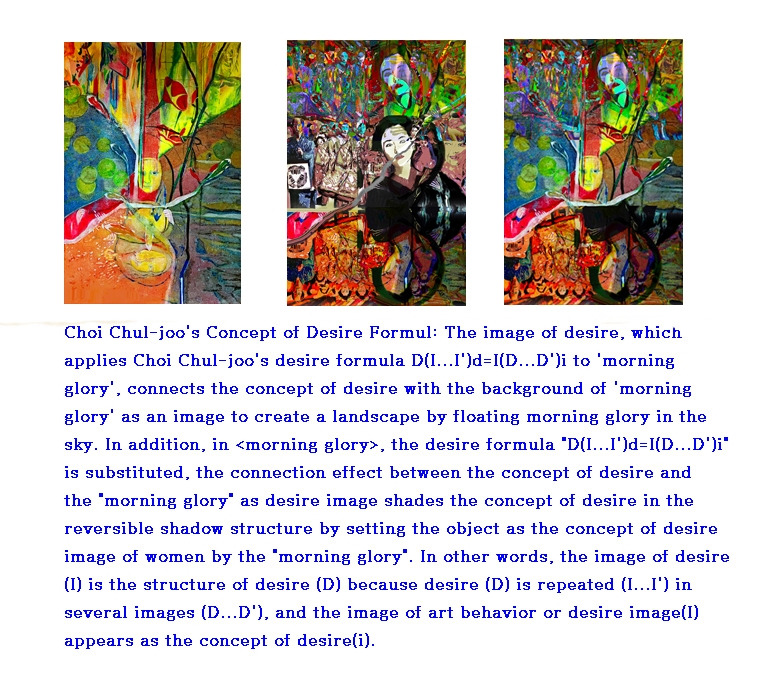 Choi Chul-joo’s application of the desire formula "D(I...I')d=I(D...D')i" to the image of “morning glory” constructs a symbolic landscape in which the flower floats in the sky, visually linking the abstract concept of desire with its aesthetic background. This formula operates as a cognitive and psychoanalytic mechanism, wherein the image of desire (I) is not merely a representation but a structural repetition of desire (D) across multiple visual instances (I...I'), which themselves reflect the recursive nature of desire (D...D'). In this framework, the “morning glory” becomes both the object and the medium through which desire is shaded, refracted, and rendered in reversible shadow structures—particularly when the object is configured as the feminine image of desire. The substitution of the formula within the artwork <morning glory> reveals a layered interplay between symbolic abstraction and visual cognition, where the image of artistic behavior or desire (I) emerges as the conceptual form of desire (i), thus collapsing the boundary between representation and structure. From a psychoanalytic perspective, this recursive logic mirrors Lacan’s notion that desire is constituted through the gaze of the Other and Freud’s view that desire is driven by unconscious repetition and symbolic substitution. Cognitively, the formula encodes how the mind processes desire not as a static object but as a dynamic system of mirrored images and temporal shadows, ultimately transforming abstract longing into a visual syntax of emotional architecture.
